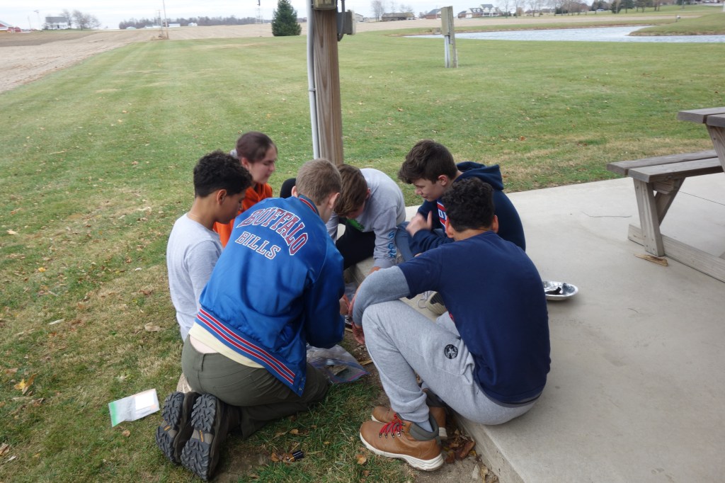 After lunch, we ran into some extremely high winds. After making sure our tents were secure (the one in the picture that is being destroyed is the only one we lost), we did the first aid challenge, which consisted of creating a hypothermia burrito wrap. After that, we continued securing tents and cleaning up from lunch before going to the firebuilding and knots challenges, as well as the second first aid challenge.