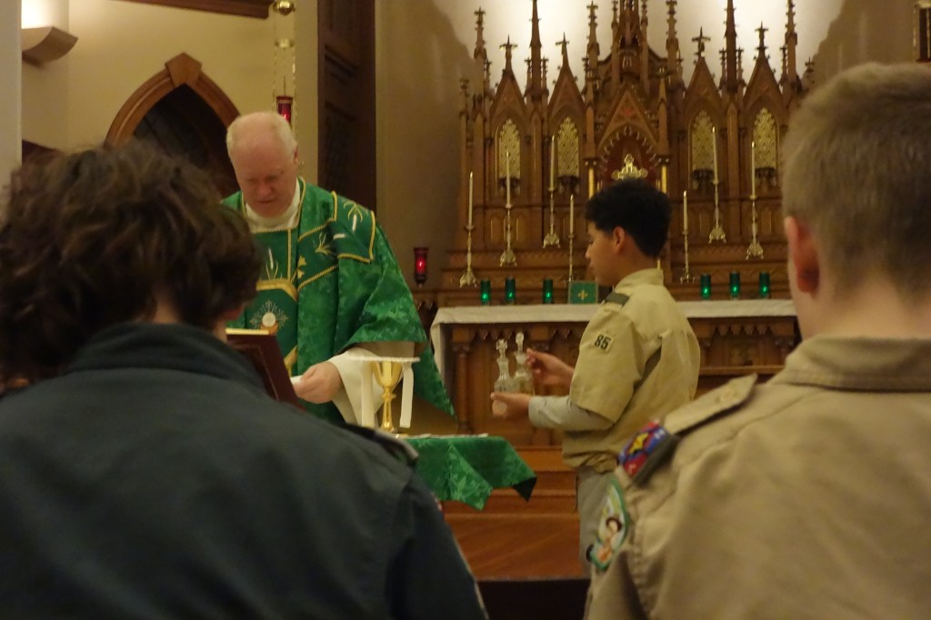After the challenges finished, we prepared our meal for a potluck dinner. After dinner, we went back to the chapel and said evening prayer before celebrating Mass. After Mass, most of the troops left due to the high winds, but we stayed, along with one other troop. Then, we went to cracker barrel, said night prayer, and finally retired for the night. The next morning, we ate breakfast, and said morning prayer as a group before breaking camp.